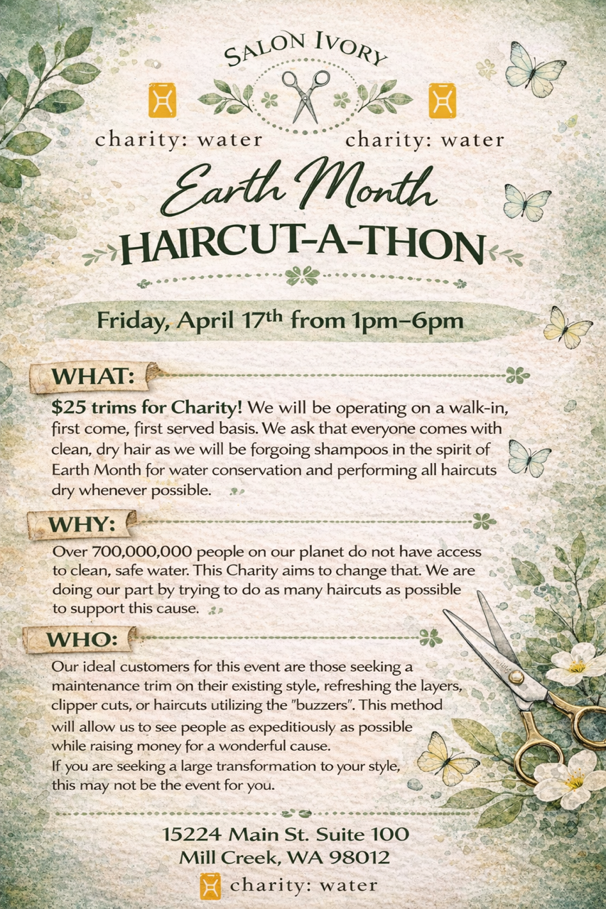 Haircuts will be offered for $25 per haircut. We will also be offering hand and arm massages for $1 a minute (Average Cost, $5 for both). 100% of all donations will go toward Salon Ivory’s and Aveda’s Partnership with charity: water